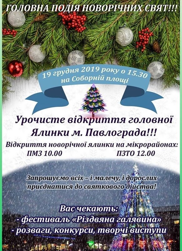 19 грудня 2019 року о 15:30 на Соборній площі відбудеться урочисте відкриття головної ялинки Павлограда!