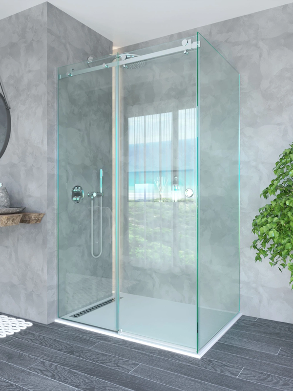Не менее популярна установка в угол. В этом случае раздвижная система комбинируется с одной или двумя фиксированными стеклянными стенками, что позволяет эффективно использовать угловое пространство и при этом сохранить эстетику.