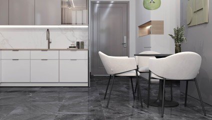 Крупноформатная плитка и декоративные коллекции создают эффект бесшовного покрытия, добавляя интерьеру современный и гармоничный вид. Она устойчива к высокой проходимости, поэтому подходит для прихожих и холлов.