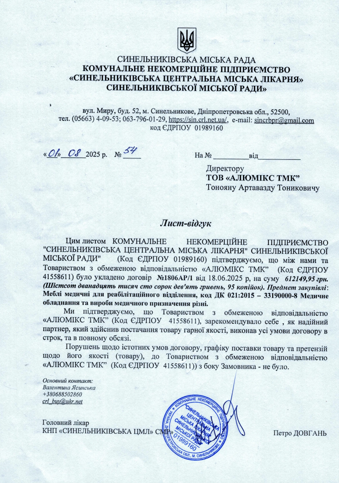 «Ми підтверджуємо, що Товариством з обмеженою відповідальністю “Алюмікс ТМК” здійснено постачання товару гарної якості, виконано всі умови договору в строк та в повному обсязі. Порушень графіку поставки чи претензій до якості — не було. Компанія проявила себе як надійний партнер, який відповідає сучасним стандартам і високим вимогам системи охорони здоров’я».